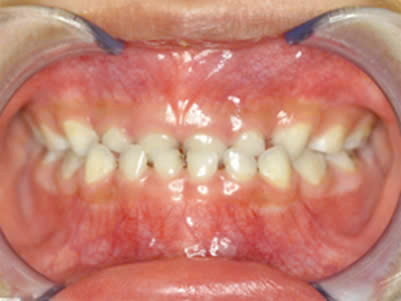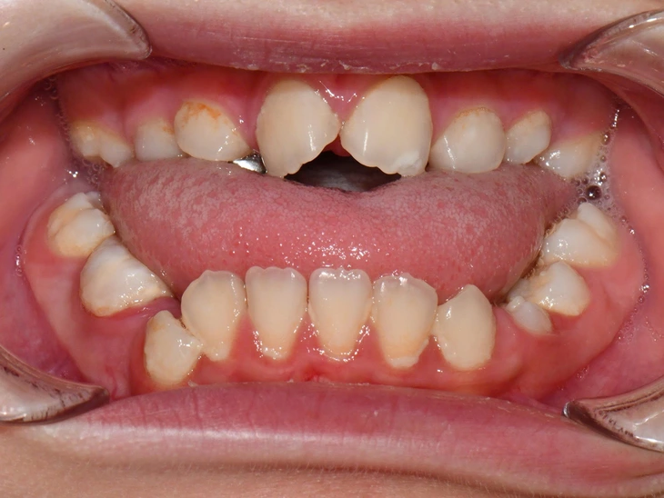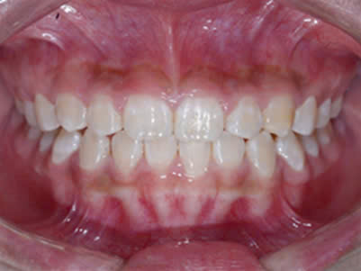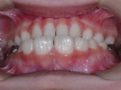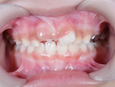 Hình 5 và 6: Bệnh nhân cắn ngược nhóm răng sữa, sau quá trình theo dõi và điều trị với khí cụ Myobrace cho hiệu quả rất cao, hết cắn ngược, răng vĩnh viễn đều đẹp.