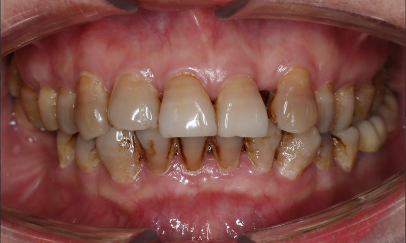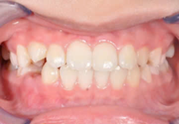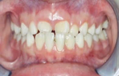 Hình 3 và 4 : Bệnh nhân có cắn chéo, tụt lợi vùng răng cửa dưới, sau khi đeo khí cụ Myobrace tình trạng đã được cải thiện đáng kể