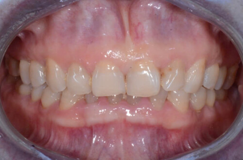– Bề mặt răng bị dẹt và mòn, có thể để lộ lớp ngà răng màu vàng bên dưới.