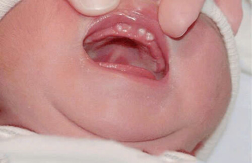 Răng sơ sinh rất hiếm gặp và thường nằm ở vùng răng cửa dưới. Chúng có xu hướng di động vì chúng thiếu chân hoặc quá ngắn. Những chiếc răng này thường được nhổ để tránh việc nuốt phải. Răng sơ sinh có thể liên quan đến các bệnh lý về phát triển và các hội chứng đã được công nhận, bao gồm Rubinstein-Taybi, Hallerman-Streiff, Ellis-can Creveld, Pierre-Robin, pachyonychia congentia, polydactyly xương sườn ngắn loại II, steatocystoma multiplex, cyclopia, và Pallister-Hall. Do đó, cần đánh giá di truyền nếu bệnh nhân có đặc điểm dị hình khác.