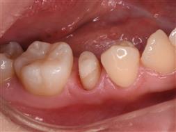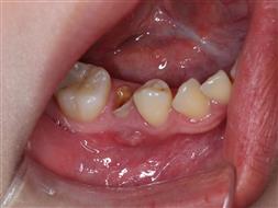 Răng sâu vỡ mất phần lớn mô răng, tủy hoại tử, có lỗ rò mủ ở lợi mặt ngoài